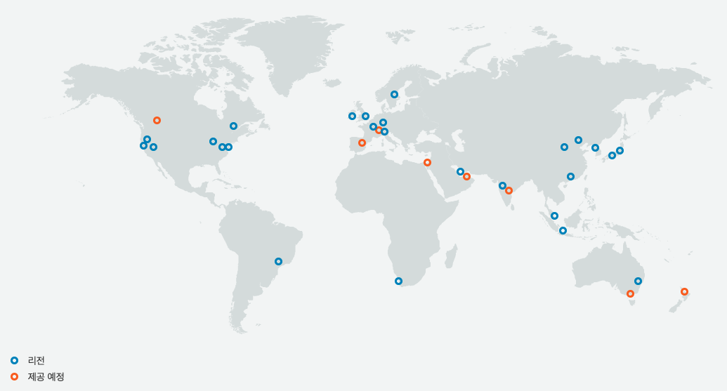AWS가 전 세게에서 데이터 센터를 클러스터링하는 물리적 위치를 리전이라고 합니다. 이 글을 게시하는 시점을 기준으로 아시아에는 베이징, 닝샤, 싱가포르, 도쿄, 시드니, 서울, 뭄바이, 홍콩, 오사카, 자카르타의 10개의 리전이 존재합니다. 주로 리전은 도시를 중심으로 구분이 됩니다.