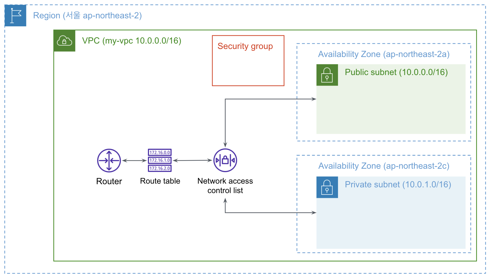 VPC를 생성하면 기본적으로 라우팅 테이블, 네트워크 ACL, 보안그룹이 생성됩니다.