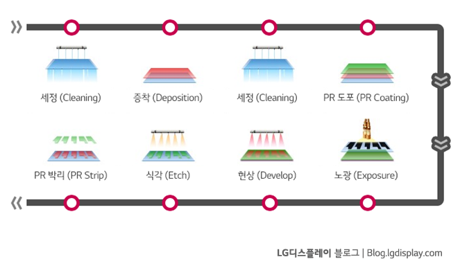이 중 TFT 제조 공정은 아래와 같은 단계를 거쳐 완성됩니다.