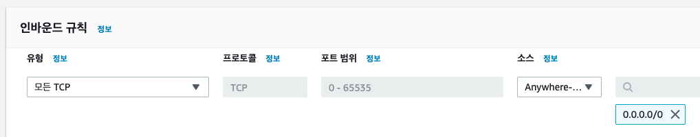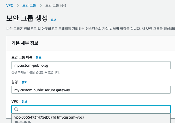 보안그룹은 EC2 인스턴스 레벨로 적용되기 때문에 차후 public subnet에 EC2 설치 시 적용할 mycustom-public-sg 보안그룹을 미리 생성해 둔다. (인바운드 규칙 레벨은 모든 TCP 범위로 설정한다.)