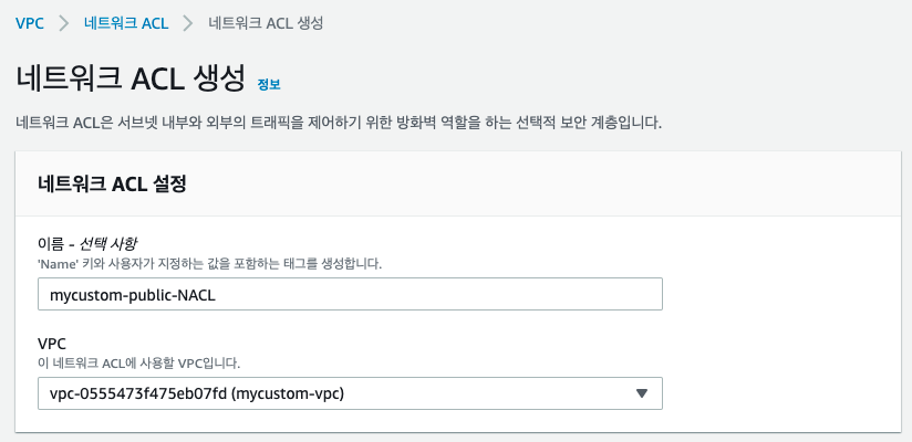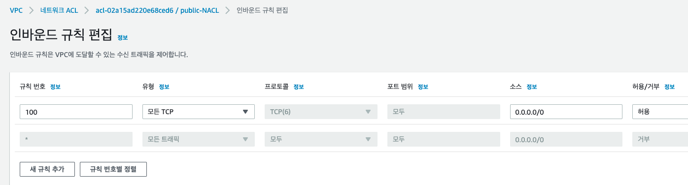 다음으로 public 네트워크 ACL (서브넷 단위의 네트워크 트래픽 규칙 관리)을 추가한다.