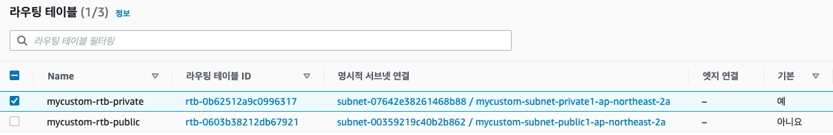 - mycustom-private1-ap-northeast-2a 를 "기본 라우팅 테이블 설정" 작업을 통해 기본 라우팅으로 변경한다.