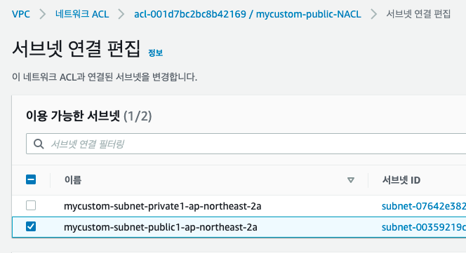 생성한 mycustom-public-NACL은 public-subnet과 연결한다.
