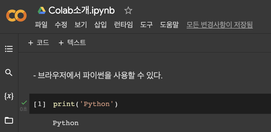 코드를 삽입하여 실행결과를 확인할 수 있고, 해당 코드에 대한 텍스트 설명도 추가할 수 있다.