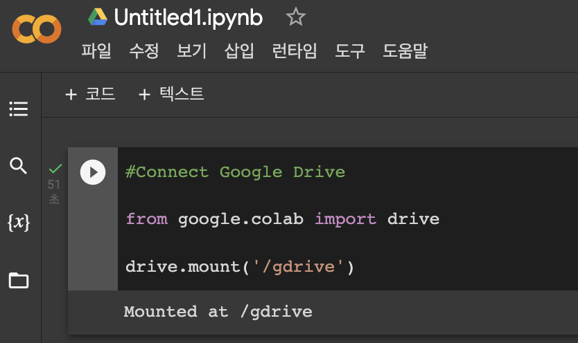 "Mounted at /gdrive" 메시지가 나오면 성공적으로 연결된 것이다.