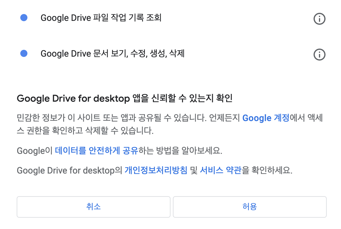 상기와 같은 팝업창에서 "구글 드라이브에 연결"을 선택하여 로그인 아이디로 연결한다.