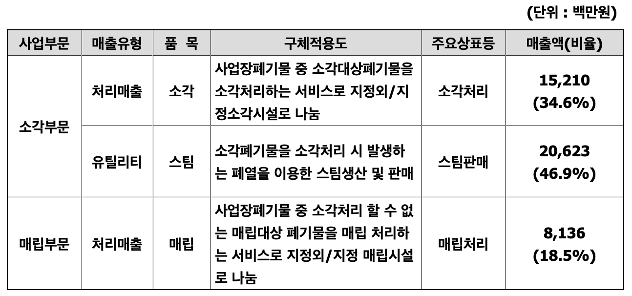 울산 지역 폐기물 소각, 매립 업체로 산업체에서 발생한 폐기물(쓰레기, 연소재 등)을 소각 및 매립 방식으로 처리한다. 또한, 소각처리 시 발생하는 폐열을 이용한 스팀 생산, 판매도 하고 있다.