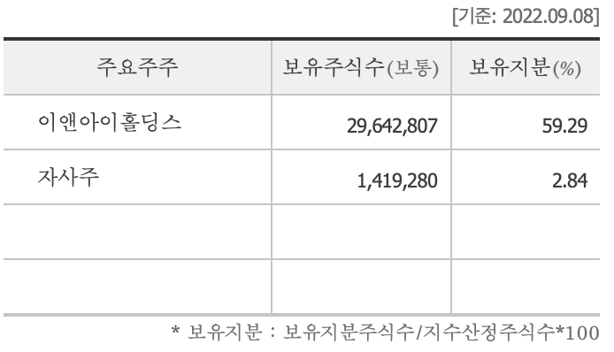 최대주주인 이앤아이홀딩스는 아이에스동서와 사모펀드 이앤에프P&E와 컨소시엄을 만들어 설립한 법인이다. 컨소시엄 내의 이앤에프P&E는 사모펀드 특성상 이익회수에 우선하여 이익에 많은 비중을 배당을 통해 이익회수에 우선한다. 이에 따라 평균 배당수익률이 5% 이상으로 높은 편이다.