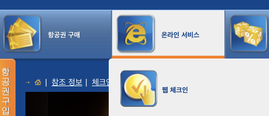 항공사 공식 홈페이지에 접속하여 "웹 체크인(Web Check-in)" 메뉴를 찾는다.