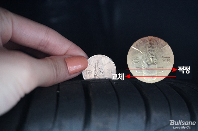 타이어의 마모 한계선을 100원짜리 동전으로 확인할 수 있다.