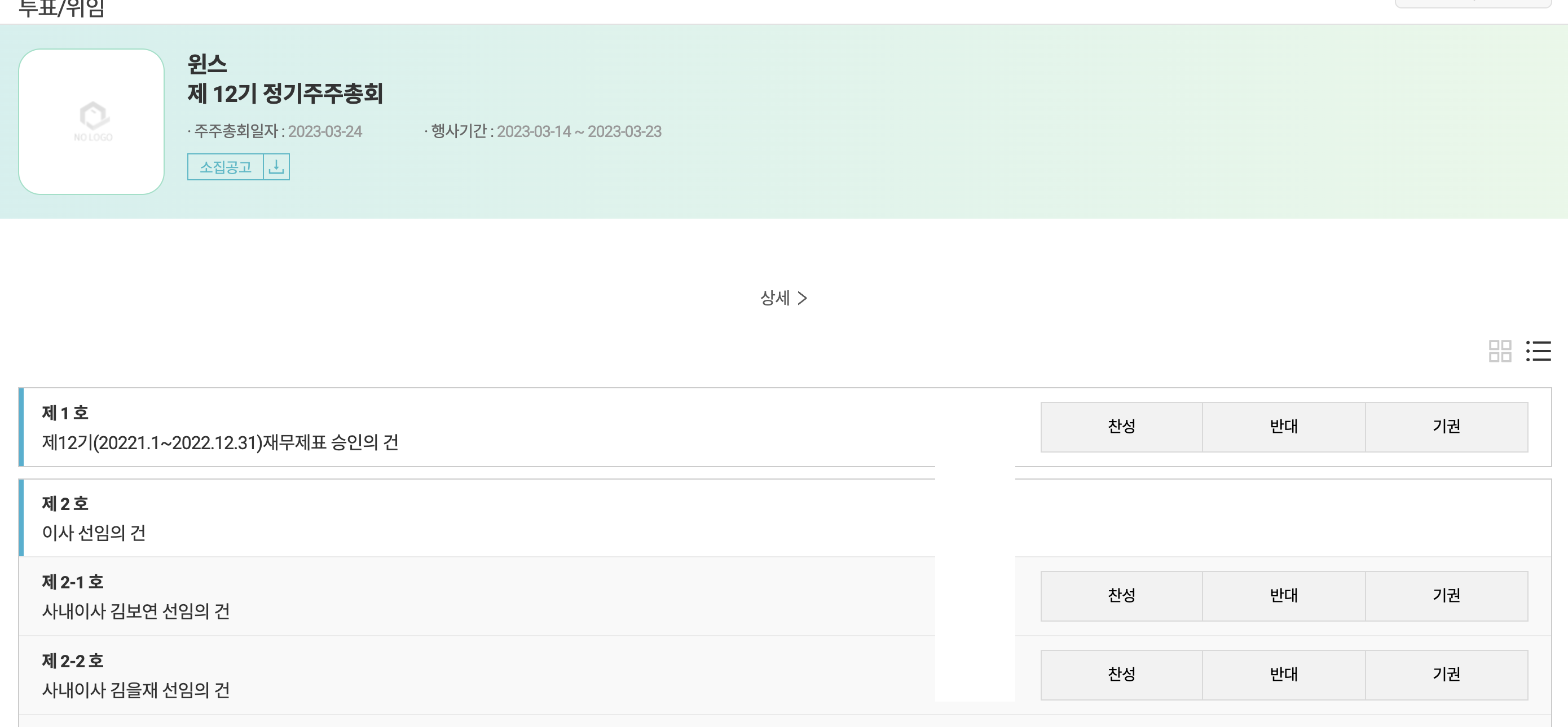 그럼 전 윈스라는 기업의 주식에 대한 의결권을 행사해보도록 하겠습니다.