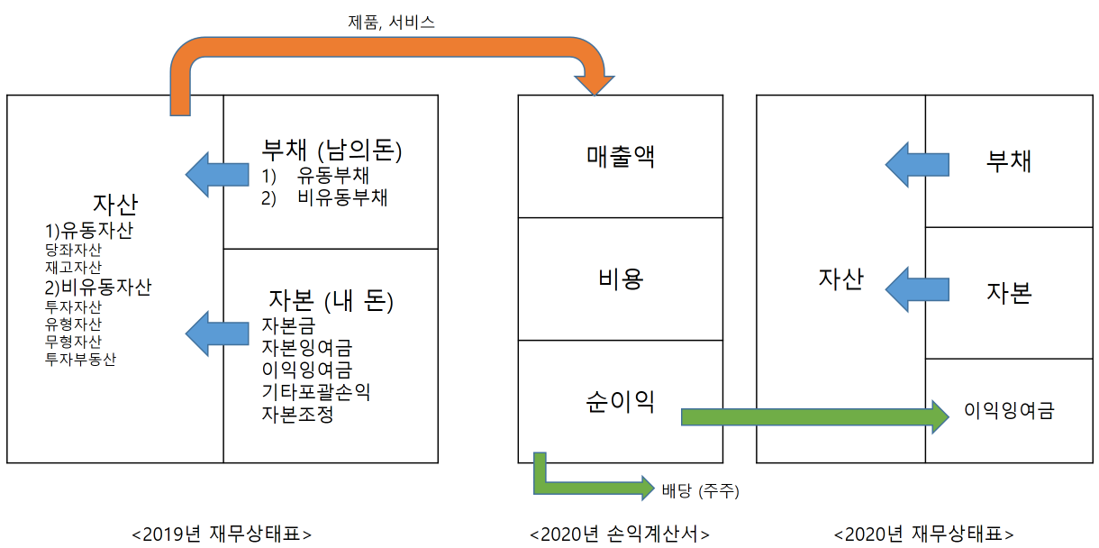 재무제표의 개념을 간략하게 설명하면 전년도 재무상태표를 기본으로 하여 올해 손익계산서를 반영하면 올해의 재무상태표가 작성된다.