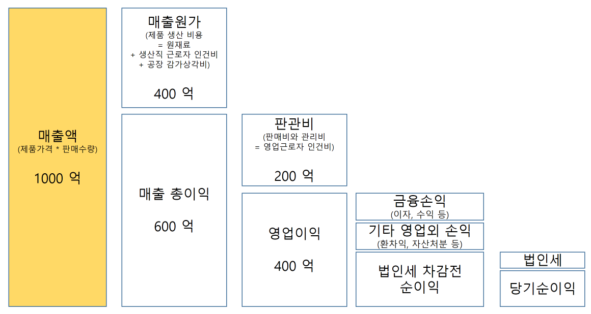 매출원가: 제품을 생산하기 위해 소모된 비용 (주로 원재료비가 많은 비중을 차지한다.)