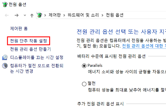 좌측 메뉴에서 "전원 단추 작동 설정" 메뉴를 클릭한다.