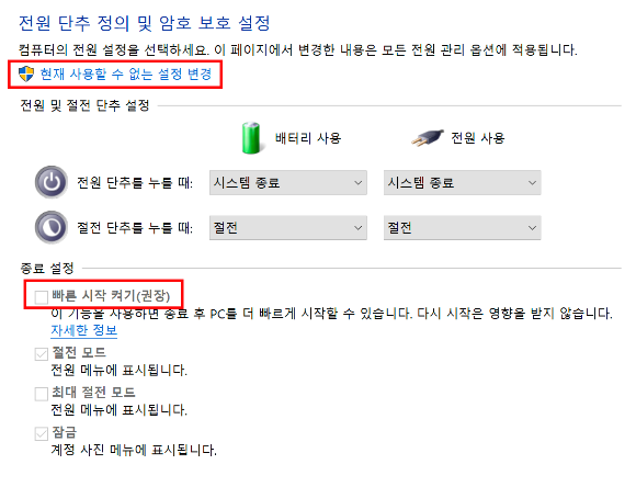 "빠른 시작 켜기 (권장)" 메뉴가 보이지만, 변경할 수 없을 것이다.