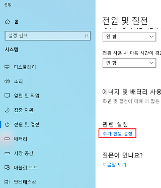 "전원 및 절전" 페이지의 맨 하단에 보면 "추가 전원 설정" 메뉴를 클릭한다.