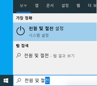 좌측 하단의 "시작" > "설정" > "시스템" > "전원 및 절전"으로 이동하거나, Windows 검색창에서 "전원 및 절전"을 입력하여 바로 창을 띄운다.